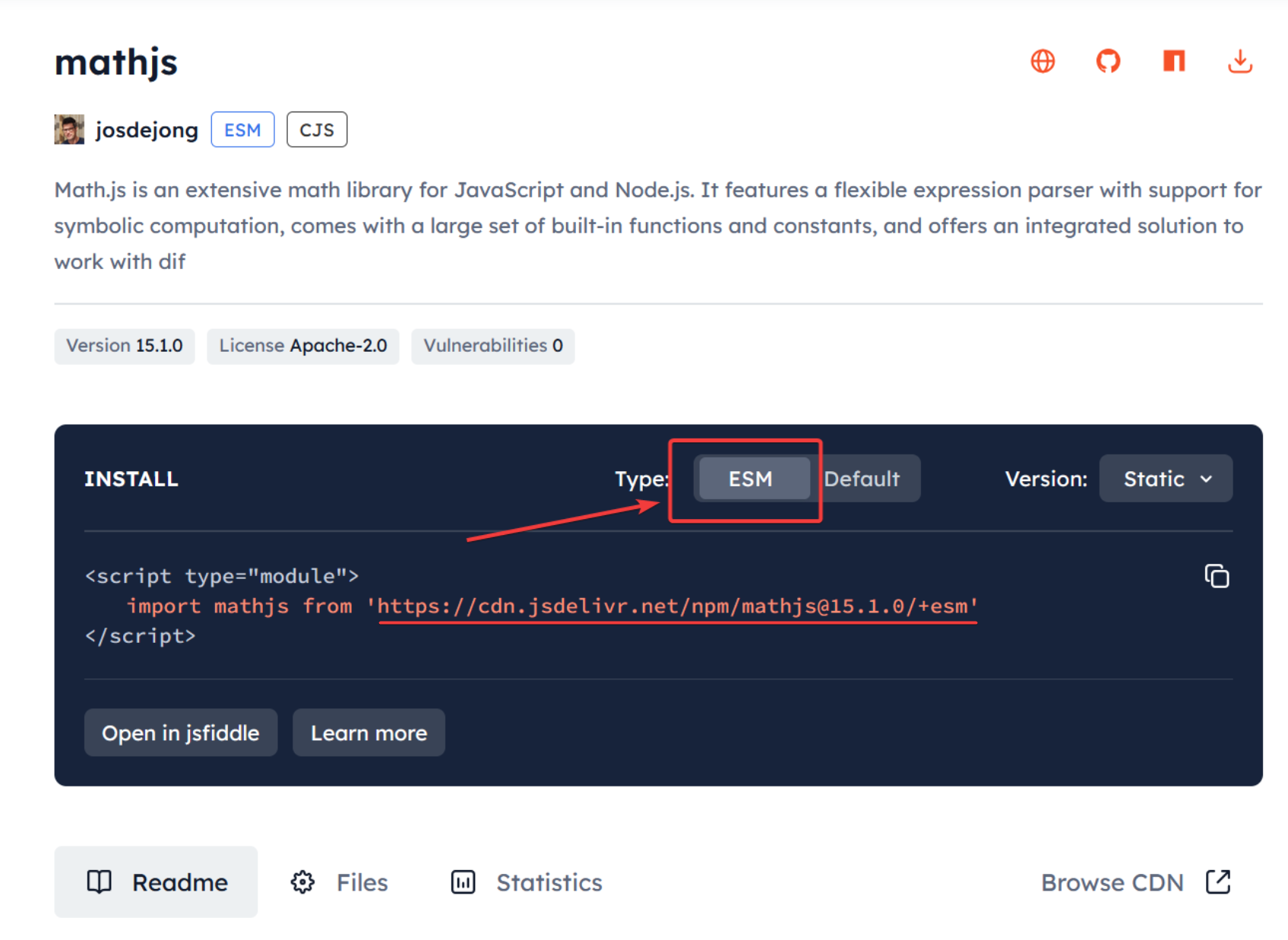 You will see the detailed information for the mathjs package, along with instructions on how to include it in HTML. Select the ESM tab in the dark box and copy the corresponding HTTP URL.