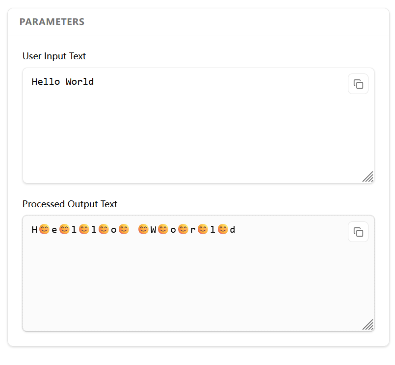 It accepts user input and inserts 😊 between each character of the input text in real time.