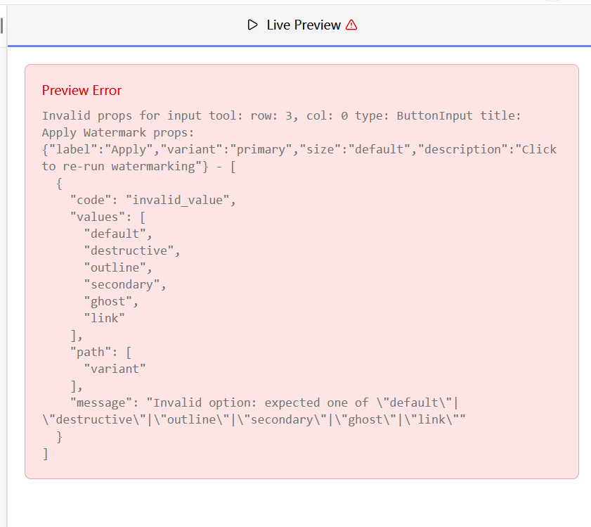 Depending on the LLM model's capabilities, generated tools may have various issues. The most common one is invalid component definitions in the generated uiWidgets JSON.