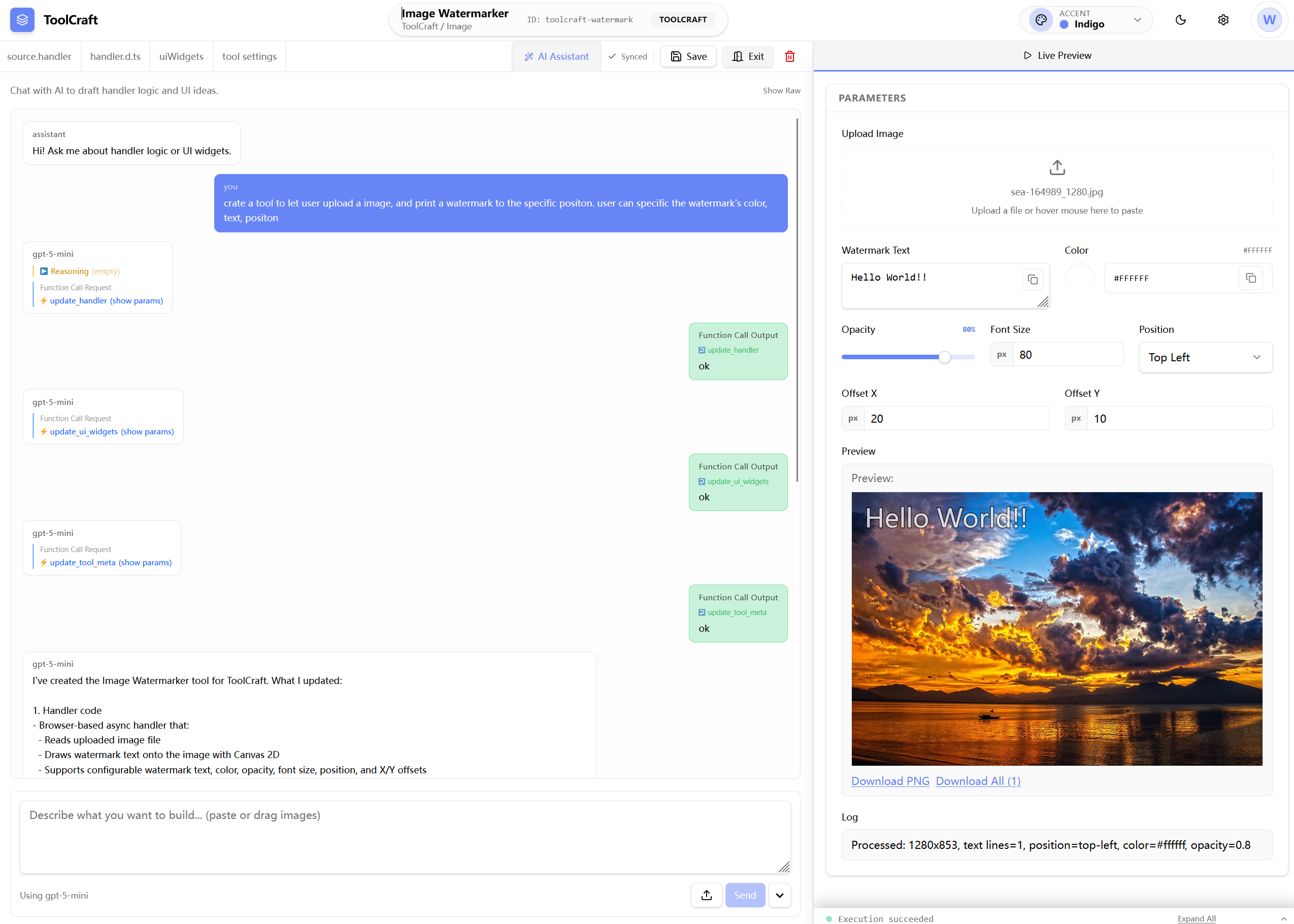 After configuring the API KEY, you can create the tools you need by chatting with the LLM. For example, if you want to create a tool that adds a watermark to an image: